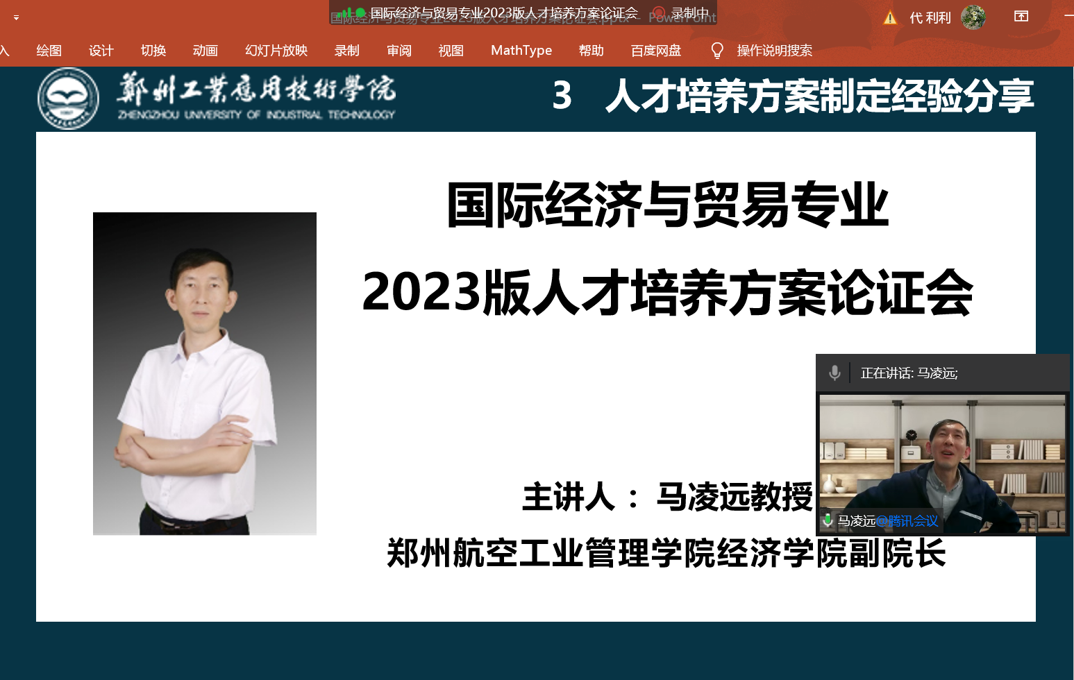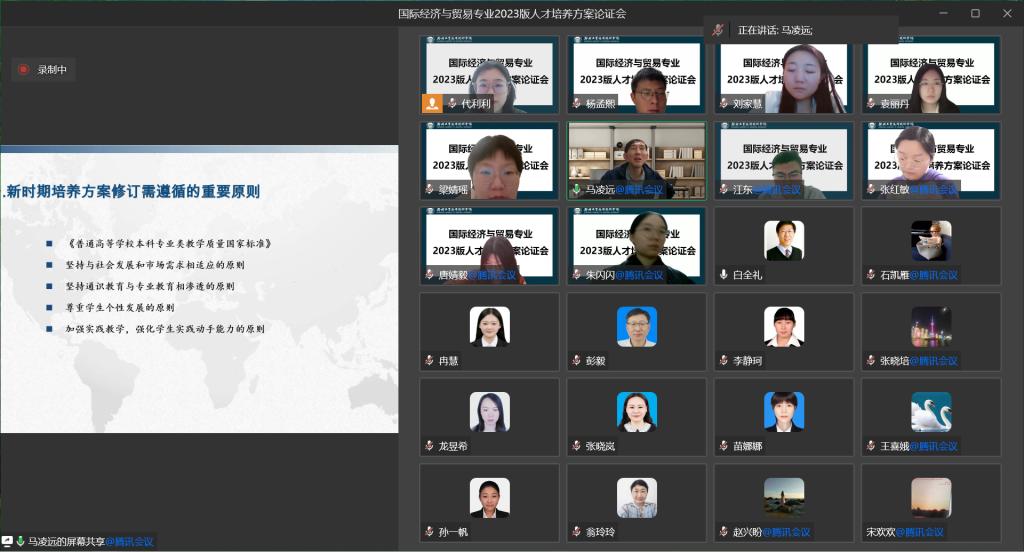 2023年4月27日晚上20:00,yl7703永利集团官网选取国际经济与贸易本科专业,以腾讯会议形式进行线上汇报。此次校级论证会特邀郑州航空工业管理公司经济公司副经理马凌远教授担任主讲人,出席本次会议的有yl7703永利集团官网国贸教研室正副主任白全礼、石凯雁;经济学教研室正副主任马静、苗娜娜;金融工程教研室主任翁玲玲以及三个教研室的全体教师。
