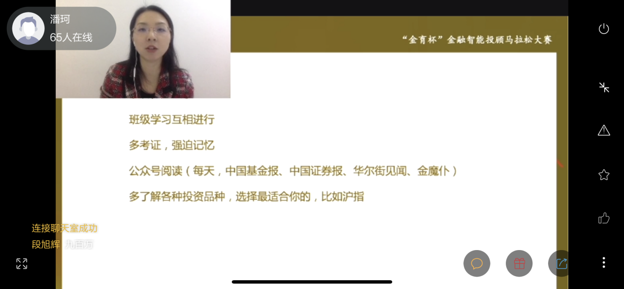 此次活动邀请了金智东博(北京)教育科技股份有限公司郭鉴旻、周筱等专家,就金融行业银行整体就业形势、各类资产配置特点、整个金融行业的认知、安全进校园及金融防诈骗等系列内容进行对相关专业的员工进行了深入浅出的授课,授课形式生动新颖,深受员工们的喜欢。同时,以此次活动为基础,举办了“金育杯”金融专业知识校级竞赛。参赛员工整体表现出良好的专业水准和竞技状态,经过激烈角逐,21级金融工程的许楚同学拿到了竞赛94.39第一名的好成绩。