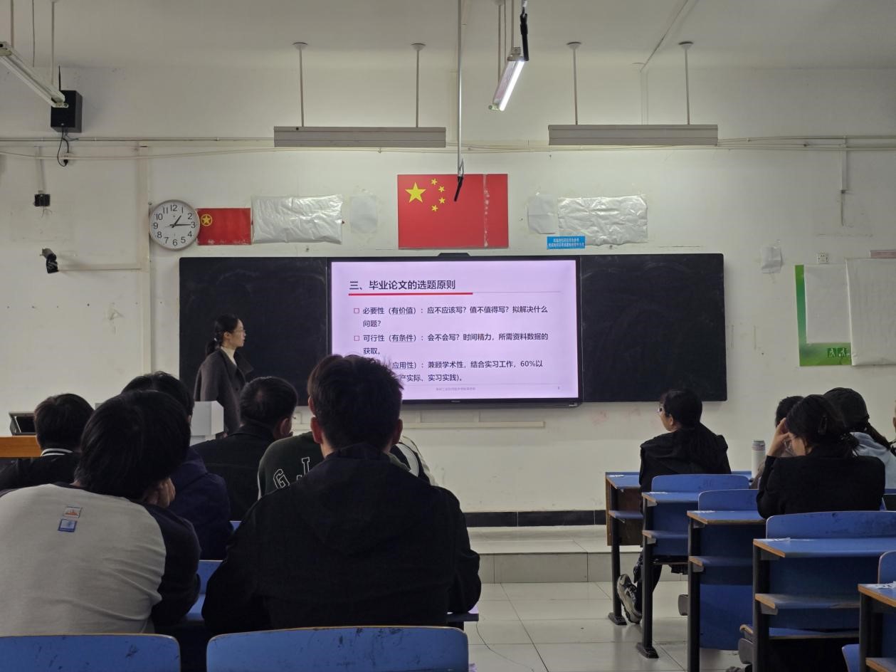 会上,黄咏梅老师向全体同学展示了毕业论文的主要内容,介绍了毕业论文撰写的基本要求及选题的原则、实习流程概览、实习时间及内容、实习要求及注意事项。