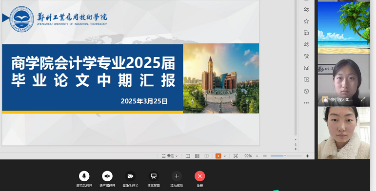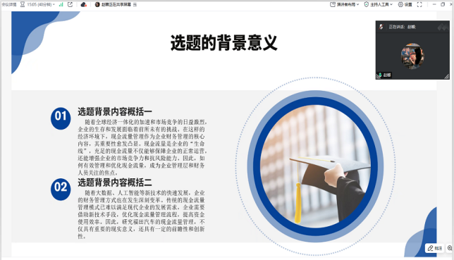 会计学专业本次中期汇报采用线上形式,通过合理分组,各小组设置组长来全面统筹中期汇报的各项事务,包括协调汇报时间、维持会议秩序等,保障了汇报工作有条不紊地进行。在汇报过程中,每位员工精心准备了时长5分钟左右的PPT,围绕论文选题背景、研究思路、进展情况以及初步成果等内容进行阐述。随后,小组老师依据员工提交的毕业论文初稿,针对研究方法、数据运用、逻辑结构等方面提出专业问题,员工当场进行回答。老师们还细致地指出员工初稿中存在的不足之处,如部分文献引用不规范、论点阐述不够深入等,为员工们提供了清晰的修改思路,指明要严格遵循学术引用标准重新梳理文献出处,鼓励员工从多角度挖掘论点,通过补充详实的数据和案例分析,让论点更具说服力,助力员工在后续写作中有效纠偏,推动论文写作不断完善。