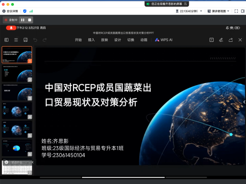 国贸专业精心规划此次线上中期汇报,通过合理分组,每组推选组长统筹协调各项事务,确保汇报流程顺畅、秩序井然。汇报期间,每位员工准备了PPT,围绕论文选题背景、研究思路、进展状况及初步成果等核心内容,进行了清晰且有条理地阐述。