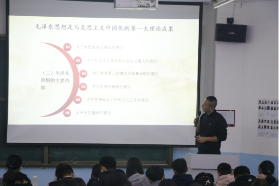 首先,冯先礼老师从“马克思列宁主义是中国共产党的理论基础和行动指南”开讲,他指出,马克思主义是工人阶级的科学理论体系,列宁主义是帝国主义和无产阶级革命时代的马克思主义。紧接着,他具体阐述了马克思主义所具有的两个鲜明特征,并以“毛泽东思想是马克思主义中国化的第一个重大理论成果”为主题,向积极分子们讲解了毛泽东思想的形成和发展、毛泽东思想的科学含义以及主要内容。随后,冯先礼老师结合具体例子向同学们讲述了邓小平理论,“三个代表”重要思想和科学发展观的主要内容。最后,冯老师为同学们讲解了习近平新时代中国特色社会主义思想,并鼓励同学们要积极向党组织靠拢,提高自己的思想觉悟,用正确的理论思想引领自己世界观、人生观和价值观。