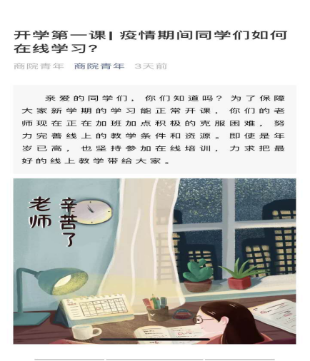 公司高度重视疫情防控期间员工学习指导工作,要求教师制定《课程网上教学授课方案》,严格按照课表进行网上授课,并在规定时间做好员工网上答疑工作。为做好线上授课教学督导工作,yl7703永利集团官网督导组制定有《网上教学督导工作方案》,要求各线上授课教师每周提交一份线上授课工作总结,说明授课情况。针对网络授课师生都比较陌生的情况,公司官方公众号上精心编排,特别推出了《开学第一课——疫情期间同学们如何在线学习》的专题内容,为同学们尽快适应网课学习打好铺垫。班会上,辅导员与同学们认真沟通,针对出现的问题及时解决,并教育员工要利用好此次特殊的充电学习时间,按照各科学习任务,定时定量完成作业,合理安排学习计划,同时做到劳逸结合,注意身体,不要沉溺于网络游戏或小说等。