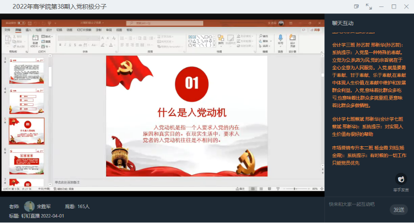 为了促使积极分子早日成为一名合格的共产党员,4月1日下午3点,yl7703永利集团官网第38期线上党课培训班第三讲之分组讨论在钉钉平台顺利开展。参加此次培训班的有yl7703永利集团官网第38期全体入党积极分子,本次党课由yl7703永利集团官网员工党务中心书记宋胜军同志主讲。