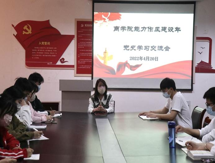 活动伊始,高珂珂老师宣布本次学习党史交流会,主要通过“党史知识竞赛”方式开展,为使党员同志们相互交流党史知识。接着高老师就“能力作风建设年”主题活动和党建工作的相关要求进行讲解,她表示:扎实开展政治理论学习和支部党建活动是关键,同时应该提升支部党员的政治素质和工作能力,我们要抓住这个契机,行动上要把这些要求落实,切实转变思想,改进作风,提升能力。她强调,全部党员同志要从党史学习中吸取精神力量,不断增强坚持初心使命思想自觉和行动自觉,要做到“四个坚持”。要以高度的政治自觉、思想自觉和行动自觉深入学习党史,毫不动摇地坚持中国共产党的领导,认真学习感悟革命先烈坚定信仰、不畏艰险、勇于牺牲的崇高风范,激发履职担当、奋发超越的热情,不断增强我们商院人攻坚克难、开拓进取的拼搏精神。