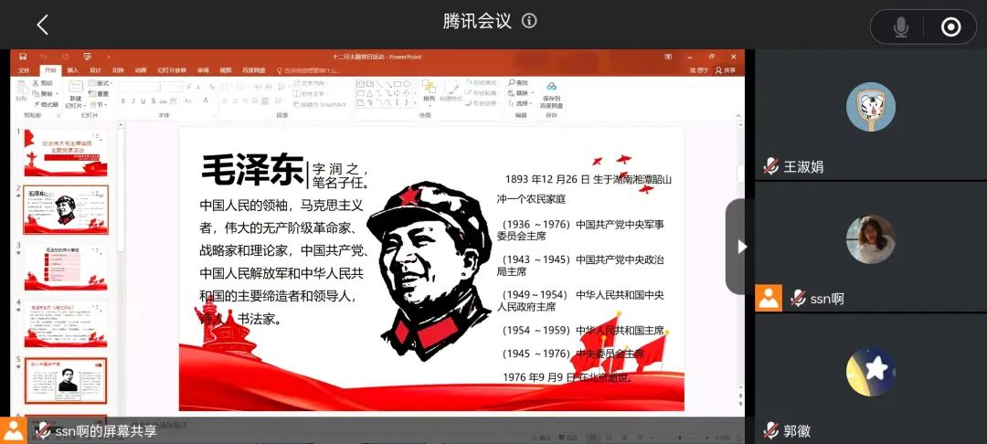 会议初始,纪检委员杜怡萱同志带领大家回顾了毛泽东同志的丰功伟绩——为中华人民共和国的缔造和我国社会主义事业的发展做出的贡献。她讲道:“毛泽东思想博大深邃、胸怀坦荡宽广,文韬武略兼备、领导艺术高超,心系人民群众、终生艰苦奋斗,这样的主席值得我们学习和敬仰。”
