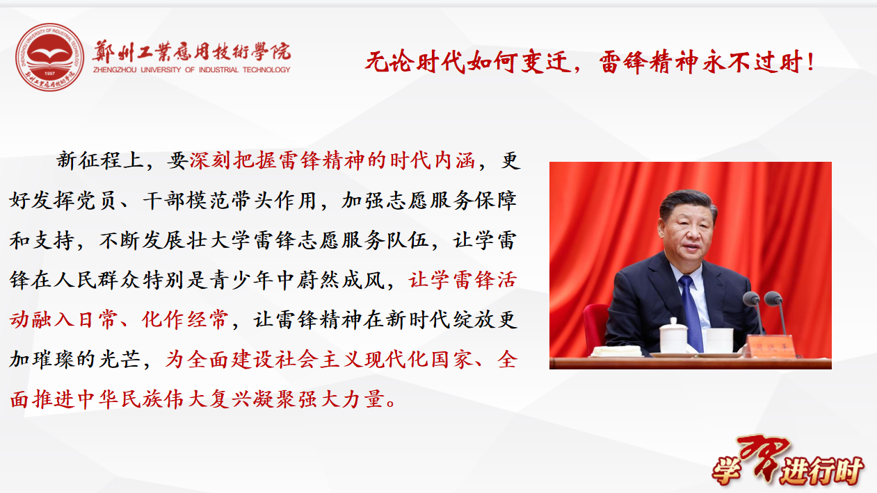 会议深入学习了习近平总书记关于弘扬雷锋精神的重要论述:实践证明,无论时代如何变迁,雷锋精神永不过时。在新征程上,要深刻把握雷锋精神的时代内涵,更好发挥党员、干部模范带头作用,加强志愿服务保障和支持,不断发展壮大学雷锋志愿服务队伍,让学雷锋活动融入日常、化作经常,让雷锋精神在新时代绽放更加璀璨的光芒,为全面建设社会主义现代化国家、全面推进中华民族伟大复兴凝聚强大力量。