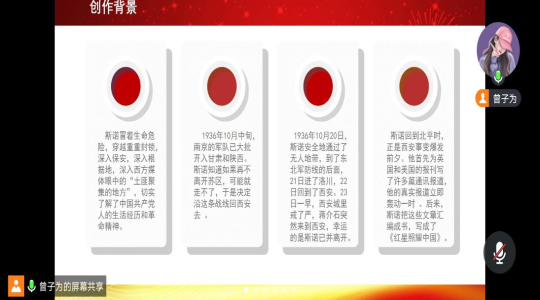会议伊始,曾子为同志以《红星照耀中国》的作者斯诺为出发点,介绍斯诺在抗战时期的故事,根据斯诺的生平事迹来引出此书的创作背景,让支部的青年同志们更好地了解抗日战争时期战争的残酷性,以及红军走向胜利的艰难困苦和顽强奋斗的过程。通过对主要内容的解读可以看出毛泽东等一批主要领导人坚韧不拔的意志和顽强拼搏的精神。