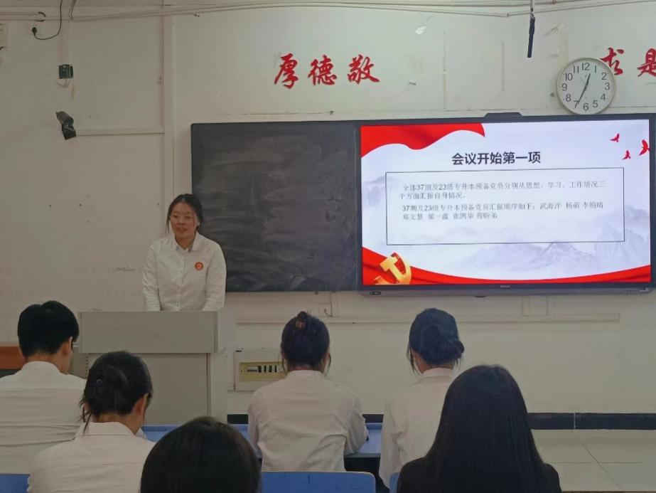会议伊始,此次的7名预备党员分别从三个方面向大会汇报了在预备期间的思想、工作、学习情况。接着,朱云洁同志介绍了以武海洋同志为代表的7位同志的有关培养考察情况,并对其能否按期转正提出意见,并由与会党员发表意见,对武海洋等7位同志能否进行转正充分讨论,经与会有表决权的正式党员采用无记名投票的方式进行表决。随后,纪检委员杨嘉星同志汇报大会表决结果,武海洋等7名同志均全票通过,同意按期发展为中共正式党员。紧接着,武海洋等7名同志依次表明了入党的态度和决心。