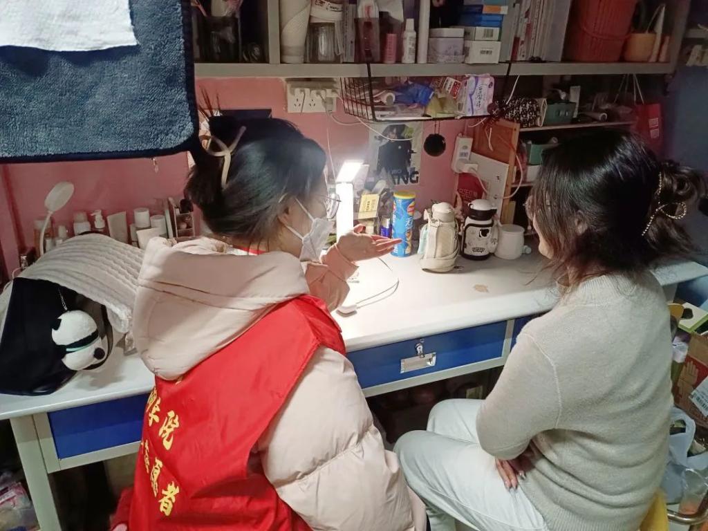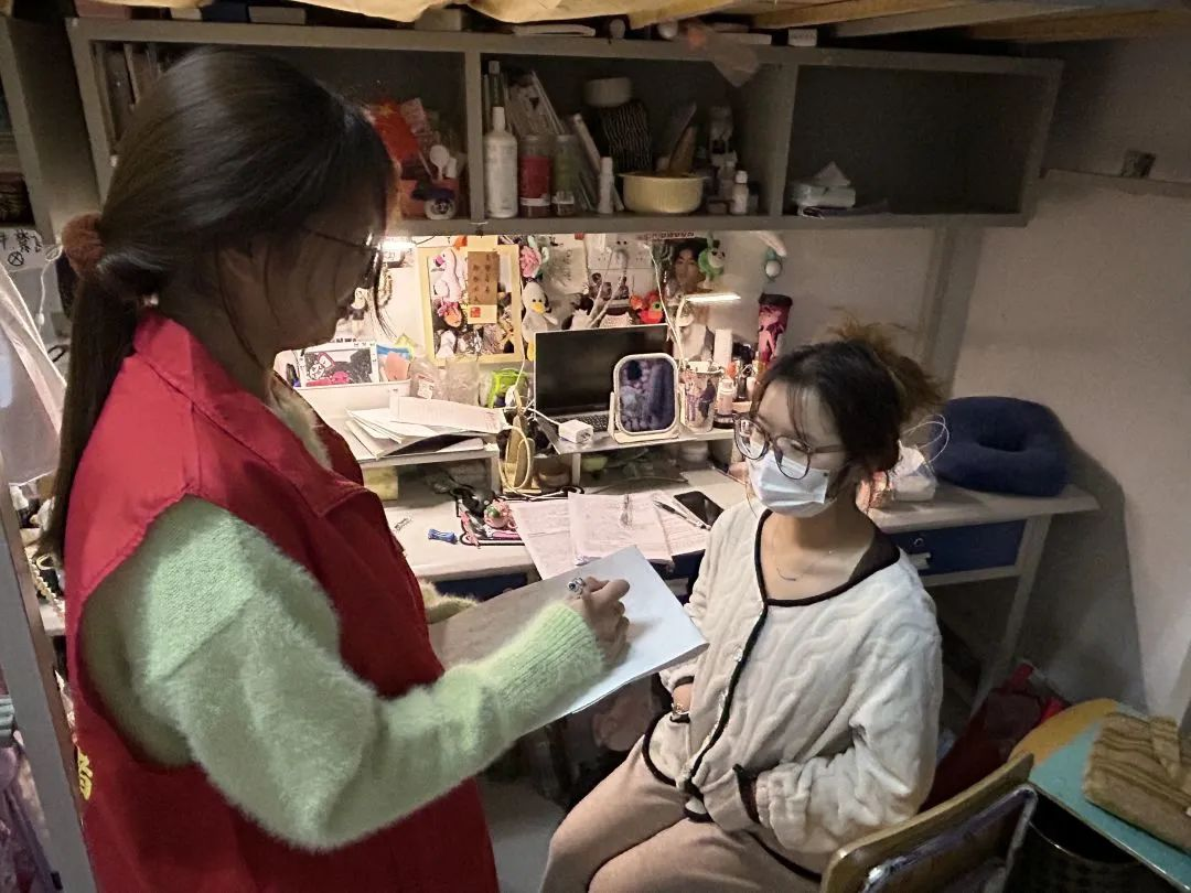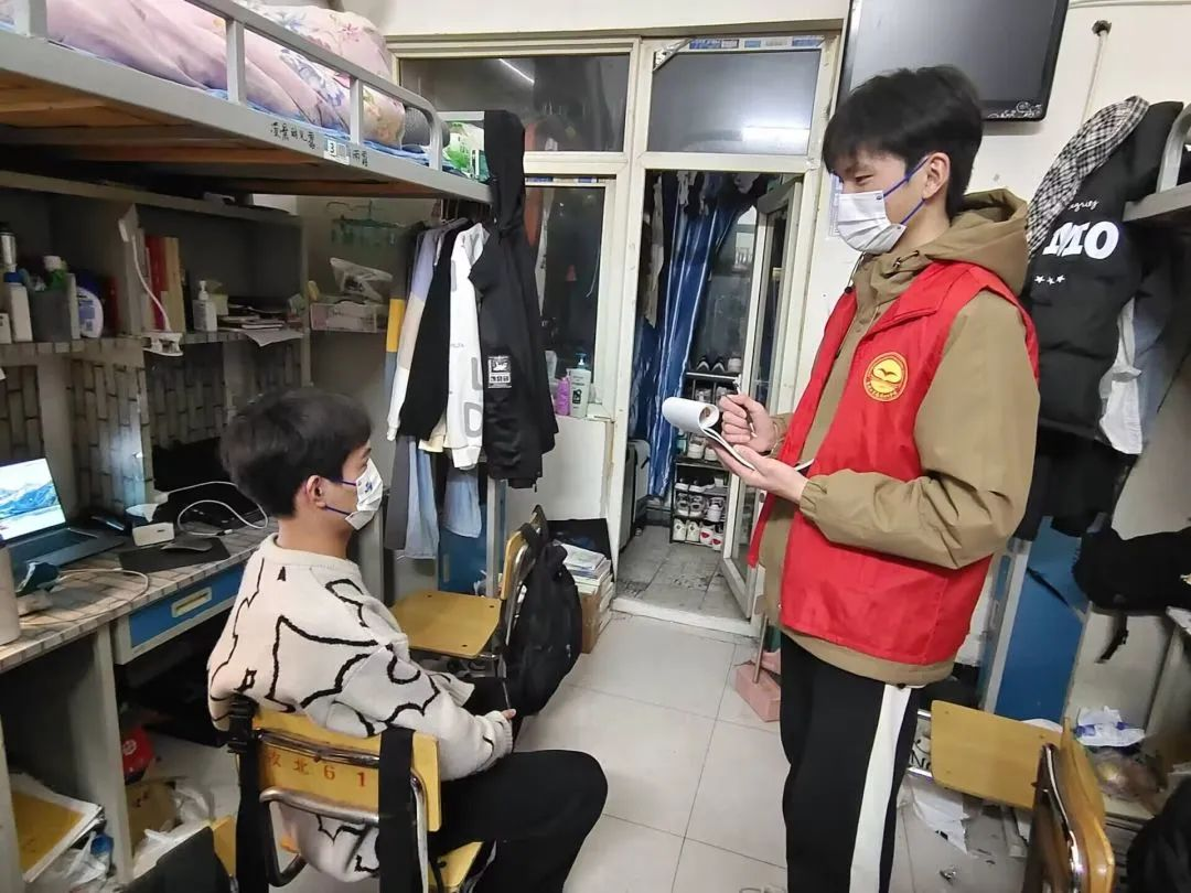 活动伊始,同志们向同学们宣传流感的来源、特点、传播途径及预防办法,叮嘱同学们在日常生活中要注意防寒保暖,做好个人防护,提高宿舍卫生意识。同时,走访过程中,同志们对存在的其他问题进行收集和整理,并提出可行性建议:对于部分宿舍没有热水供应、晚上22:00后存在嘈杂声过大的问题,上报于宿管老师处,进一步加强宿舍管理的保持力度。