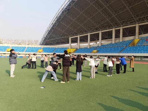 活动第一项“过河拆桥”,三组成员排成两行若干列,每行成员面对面用手臂“搭桥”。第一行两位成员同时从后几行成员胳膊下方穿过直到尾端并补充,第二行紧跟第一行,以此类推。简单的规则、激烈的气氛极大激发了所有人的激情,同学们全神贯注,相互配合,彼此的距离更近了、关系更紧了、配合更顺了。