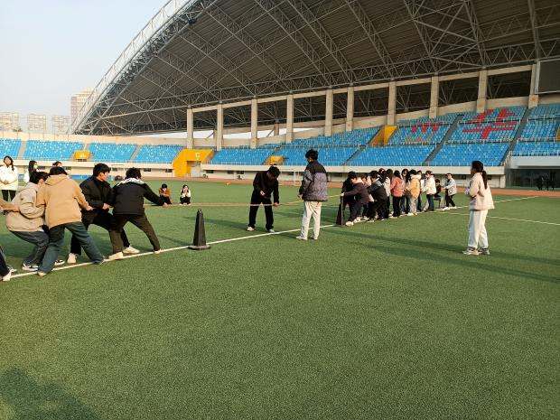 接着,三队成员们进行拔河比赛,操场上各组成员兴高采烈,精神抖擞,准备大显身手,各组成员喊着口号,一起用劲,极大提高了团队成员的凝聚力。随后又进行了贴烧饼,抓鸭子等竞赛,紧张刺激的游戏结束后,同学们团坐聊天休息,不少同学一展歌喉,迎来阵阵喝彩。