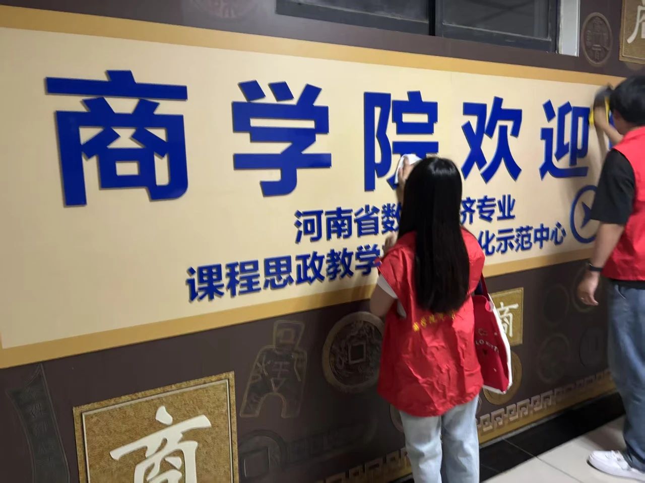 擦墙组的同学们手持抹布与清洁剂,化身"墙面美容师"。面对墙面上残留的污渍与笔痕,他们或踮脚擦拭高处印记,或蹲下清理墙裙灰尘,以"锱铢必较"的态度对待每一处细节。清洁剂喷洒、抹布反复揉搓、清水多次冲洗,经过多道工序处理,原本斑驳的墙面逐渐恢复洁净,在阳光下泛着温润的光泽。
