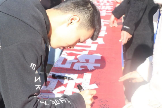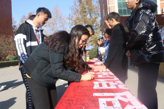 活动开始,团学干部在成才大道上悬挂鲜红的"礼赞宪法”横幅。活动中,路过的同学们纷纷在横幅上签上自己的名字,表达了同学们对遵守宪法,维护宪法的决心。活动期间,团学干部还给同学们讲述了宪法的建立、完善的历史过程、设立宪法的目的和意义。同时,告诉同学们要弘扬宪法精神,争做遵纪守法的好青年。