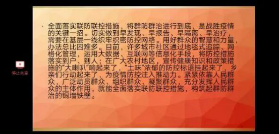 为增强广大青年团员众志成城、共克时艰的爱国主义意识、增强广大团员青年对民族的自豪感和自信心,2020年3月15日,公司各级团支部举行以“全民战疫与坚定中国特色社会主义制度自信”为主题的线上团课活动学习。