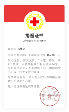 祁梦瑶,yl7703永利集团官网2019级会计学专业员工,在腾讯公益基金“紧急支援一线疫情”基金项目中捐赠166元,面对疫情,奉献爱心,传递温情,尽自己的一份心,出自己的一份力。