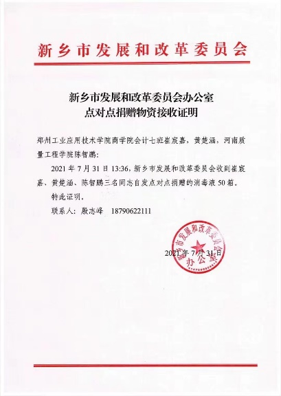 崔宸嘉,yl7703永利集团官网20级会计七班员工,积极响应号召,在抗洪救灾紧要关头,伸出援助之手,与黄楚涵及陈智鹏两名同学自发点对点捐赠消毒液50箱至新乡市发展和改革委员会办公室,在人力、物力上给予支持。