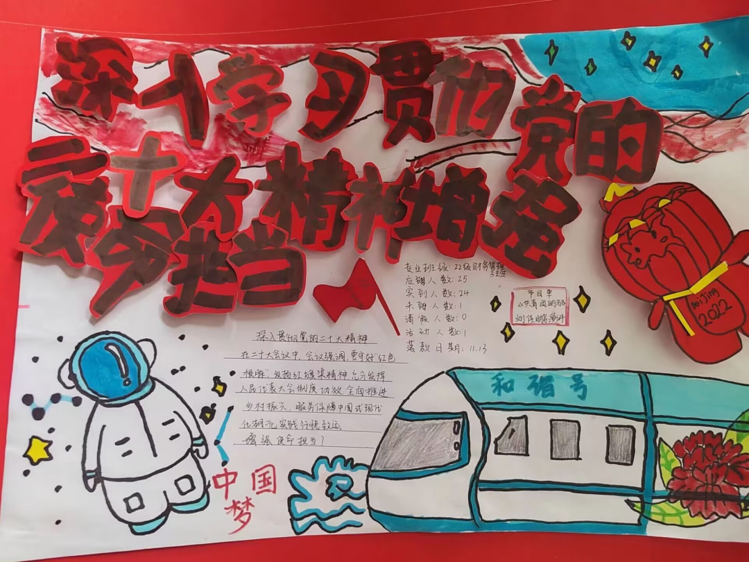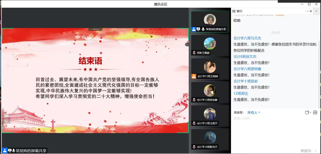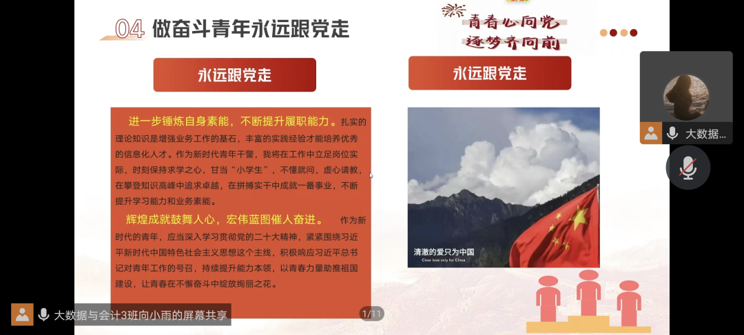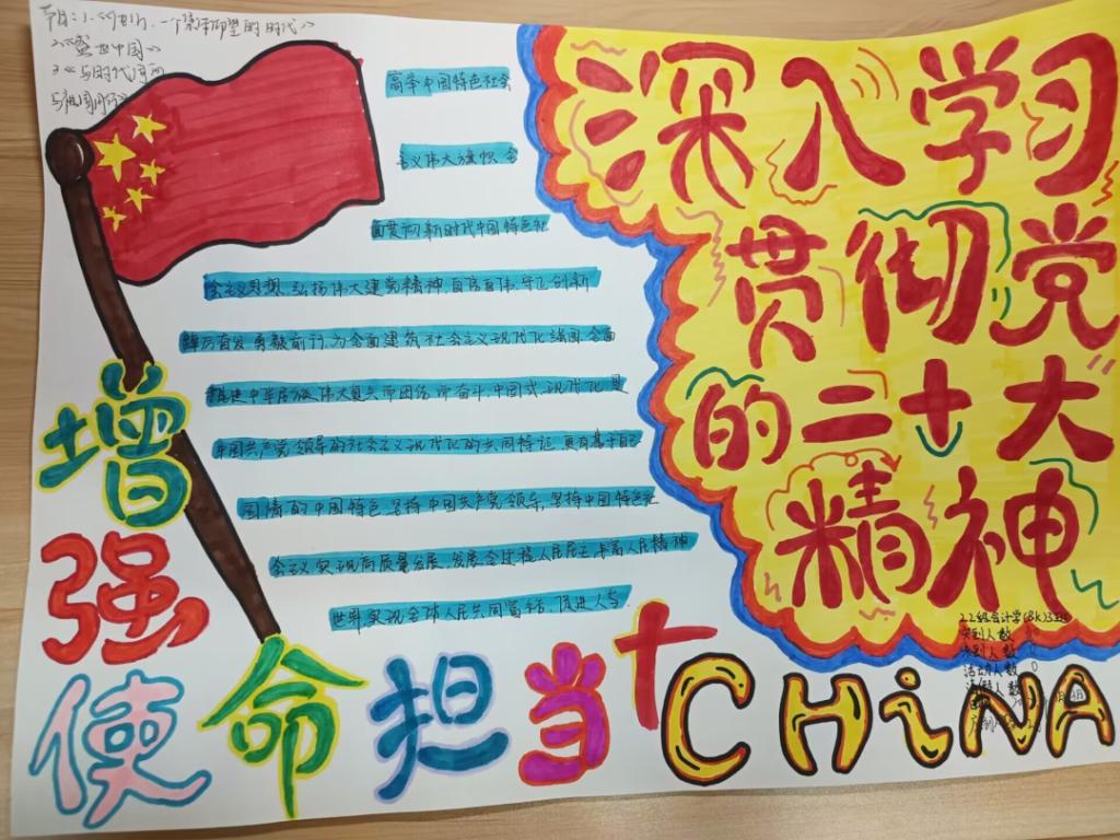 22级会计学五班的心理委员发言,在大会上习近平总书记特意强调青年强,则国家强。我们作为新时代年轻人,长在春风里生在国旗下。我将会不断学习领会党的二十大报告,把思想和行动统一到党的二十大提出的重要思想、重大举措上,高举中国特色社会主义伟大旗帜,为国家做奉献。