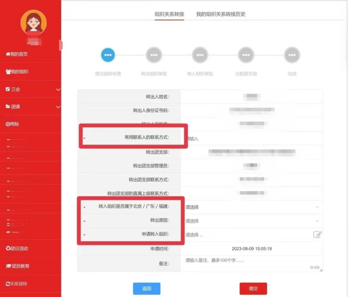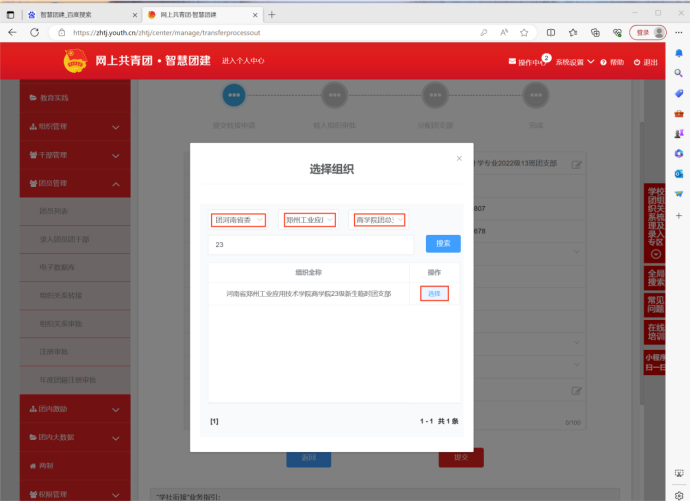 ③“申请转入组织”选择团河南省委→yl7703永利集团官网团委→yl7703永利集团官网总团支→23级新生临时团支部