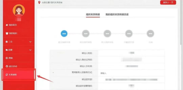在电脑PC端登录网上共青团智慧团建官网,输入身份证号码及密码,初始密码为身份证号后8位,也可能是自己或原高中团委设置的密码,若密码错误或忘记,则需向原团支部管理员或团委老师询问重置密码验证码。第二步:团组织关系转接(1)点击左下角“关系转接”。