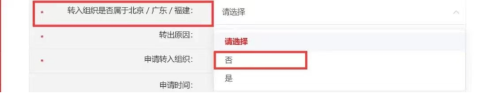 ①“转入组织是否属于北京/广东/福建”选择“否”;