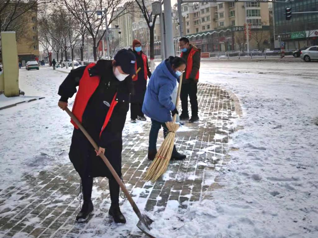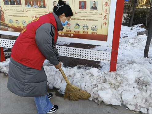 除雪中,志愿者们拿起扫帚、雪锹等工具,有条不紊地清扫社区门前及周边的积雪。大家不畏严寒、干劲十足,忙碌的身影构成了一道亮丽的风景线。通过集体的努力社区门前院内的积雪都被清扫干净,为前来办事的居民打通了安全出行通道,营造了安全畅通的出行环境。