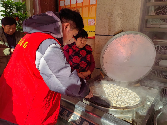 活动现场,社区志愿者和居民代表一听说要给困难居民送饺子,大家都兴致高涨,一手拿起饺子皮,一手填馅,双手合拢一捏,一个个形态各异的饺子就成型了,一双双灵巧的手把浓浓的冬至情通通包进了圆鼓鼓的饺子里。不一会儿桌上就铺满了一个个白滚滚胖嘟嘟的饺子。社区工作人员和志愿者们把煮好的饺子盛到老人们的碗里,吃着香喷喷的饺子,他们的脸上洋溢着幸福的笑容,纷纷称赞道:“今天的饺子真好吃,吃了心里暖暖的!”