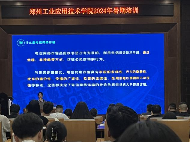 为进一步提升公司师生的网络安全意识,增强对电信网络诈骗的防范能力,推动安全校园工作建设工作深入开展,切实维护师生财产安全和自身利益,2024年7月15日下午,由新郑市公安局反诈中心张春子警官主讲的《警惕诈骗新手法·不做电信诈骗人》专题培训于公司建工楼天健厅开展,培训结束后,公司全体辅导员于文华3-203会议室就培训内容开展集中研讨。