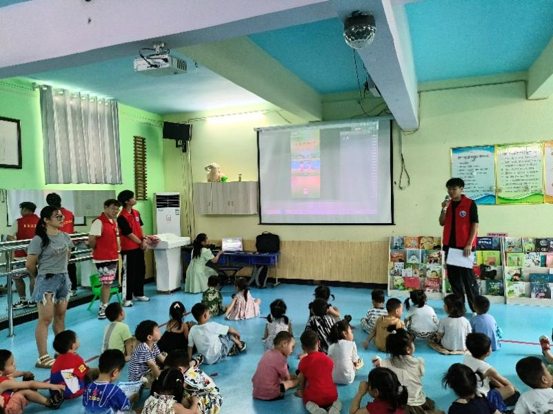 7月26日上午,志愿者们井然有序地走进了寇店镇实验幼儿园,他们首先向小朋友们分发防溺水宣传页。随后,借助多媒体设备播放了防溺水安全教育短片,在老师们的协助下,志愿者与孩子们进行了温馨的互动,并生动地向幼儿园的老师和小朋友们普及防溺水知识。在这样的环境中,志愿者有效地普及了防溺水安全知识,增强了老师和小朋友们的自救防护意识。