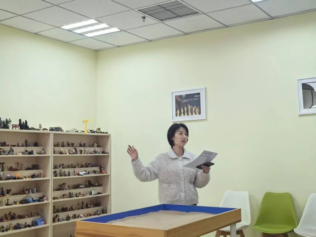 活动中,岳老师带领辅导员们进行了团体沙盘实践。通过选取沙具、摆放沙具,引导参与者们在自由、安全的环境中表达内心世界,搭起一座从无意识到意识、从语言到非语言的桥梁。参与者分析沙盘中的消极认知模式,一位老师在沙盘实践中感慨:“沙具摆放如同梳理情绪脉络。”