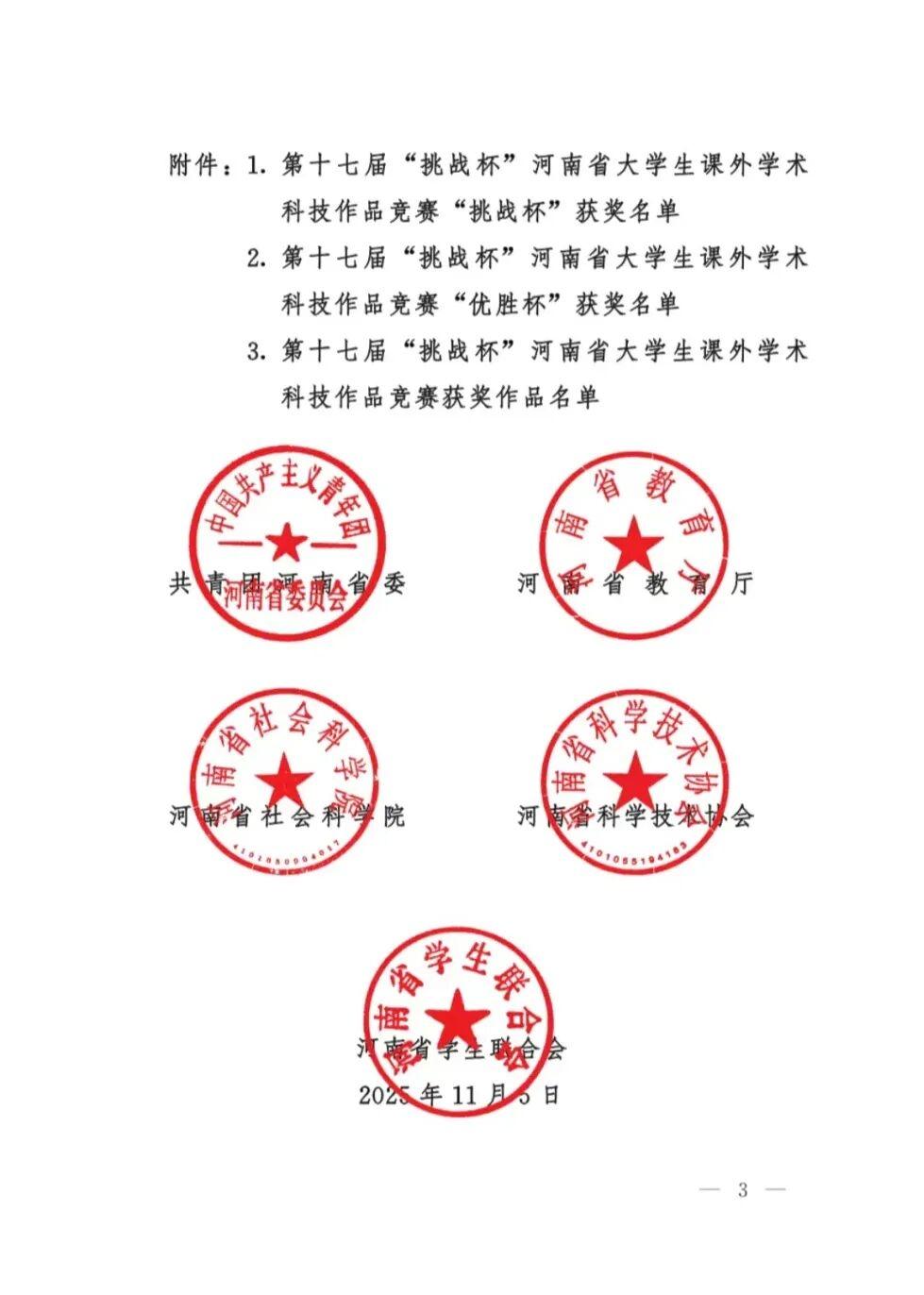 近日,第十七届“挑战杯”河南省老员工课外学术科技作品竞赛获奖名单正式公示,公司yl7703永利集团官网参赛队伍凭借扎实的学术功底、创新的研究视角与出色的实践能力,在全省155所高校4111件作品的激烈角逐中脱颖而出,喜获哲学社会科学类特等奖1项、哲学社会科学类三等奖2项、理工科类三等奖1项,为公司与公司赢得了荣誉!