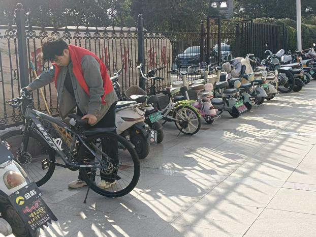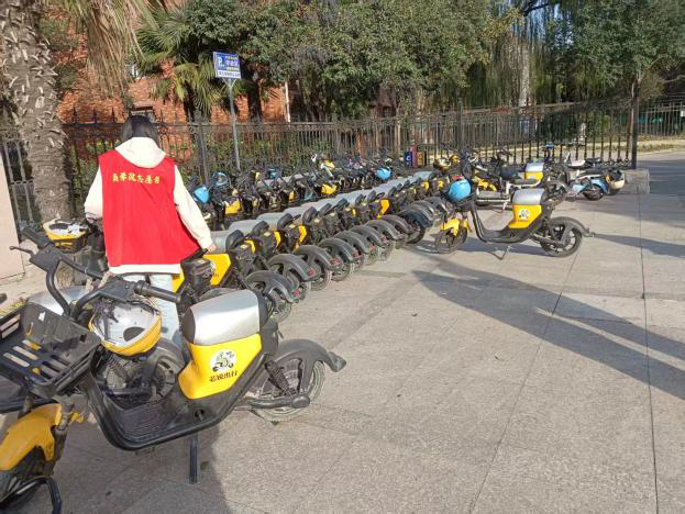 活动期间,志愿者们分工协作、干劲十足。他们穿梭于校园各楼栋出入口、停车区域,对随意停放的共享单车、电动车进行逐一规整,将车辆按照“同向、整齐、紧凑”的标准摆放到位。遇到车辆倾倒的情况,大家合力扶起;发现停放位置挤占通行通道的,及时调整至指定区域。志愿者们忙碌的身影,成为校园里一道动人的风景线。