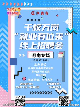 一键检索,即可查看心仪职位!快速投递简历,直接送达!企业与毕业生双向选择,精准定位!高效与HR对接交流,提高招聘效率!团团联合智联招聘的“千校万岗·就业有位来”线上招聘会河南专场暨河南共青团“百校千岗”线上就业服务季首场招聘会火热来袭。