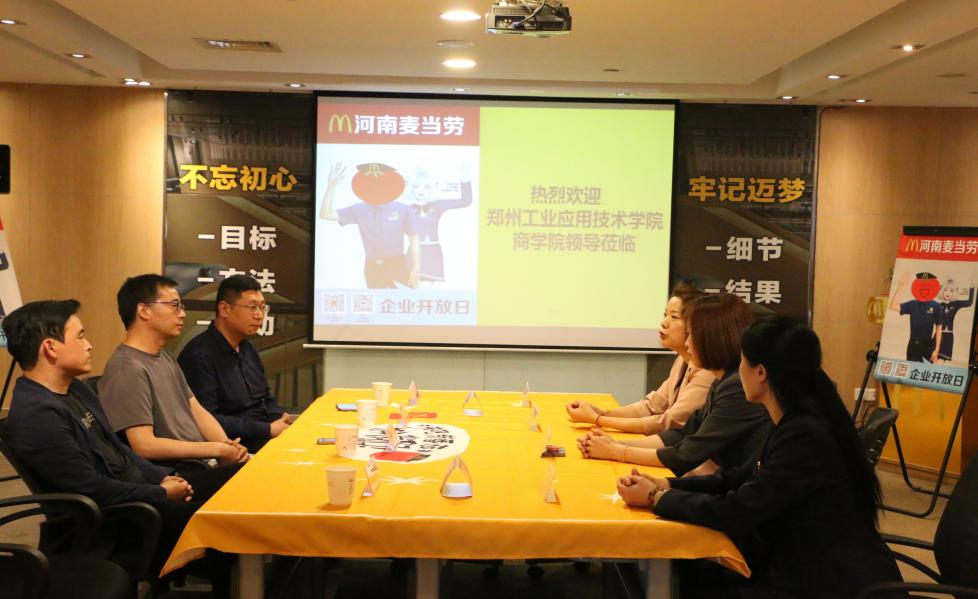 赵经理一行先实地考察了河南迈乐佳餐厅食品有限公司(麦当劳),随后,与该公司举行了座谈会,双方就校企共同拓展就业岗位、创新合作人才培养模式、实习实践基地等方面进行沟通。首先姚海玲经理对公司的整体情况、业务板块、发展前景等方面进行了详细的介绍,并表达了校企双方强烈合作的意愿。赵经理向企业介绍了公司和公司发展历程、人才培养以及近年来毕业生就业等方面具体的情况,并就双方合作提出了针对性的意见和建议,经过校企双方充分深入的交流,在毕业生就业、校企合作这方面达成了多项共识。