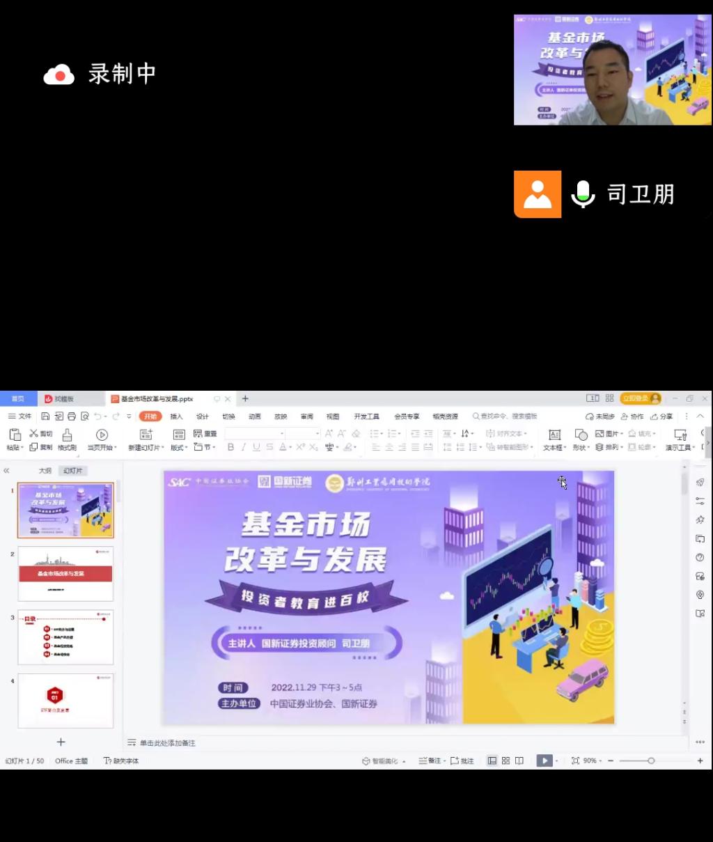 11月29日下午,国新证券郑州商务外环路营业部财富总监司卫朋先生应邀以线上形式为公司师生做了题为“基金市场改革与发展”的学术报告。yl7703永利集团官网部分中青年骨干教师,以及金融工程、经济学等相关专业员工200余人在线参加,yl7703永利集团官网副经理马克林副教授主持报告会。