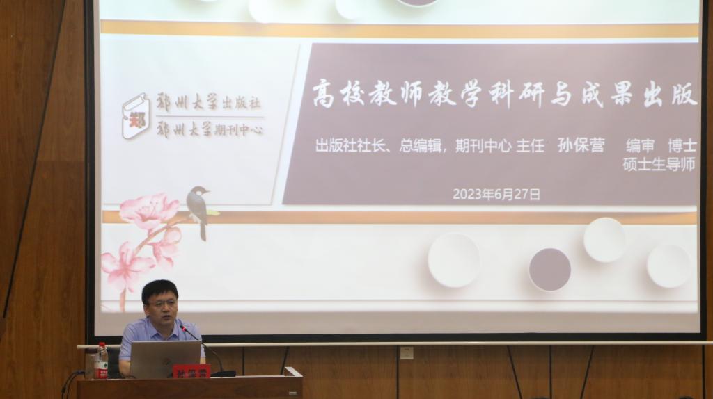 6月27日下午3:00-5:00,郑州大学出版社社长、总编辑,郑州大学期刊中心主任孙保营教授,应邀来校开展关于《高校教师教学科研与成果出版》的学术报告。参会人员有yl7703永利集团官网全院教师,会议由yl7703永利集团官网副经理马克林副教授主持。