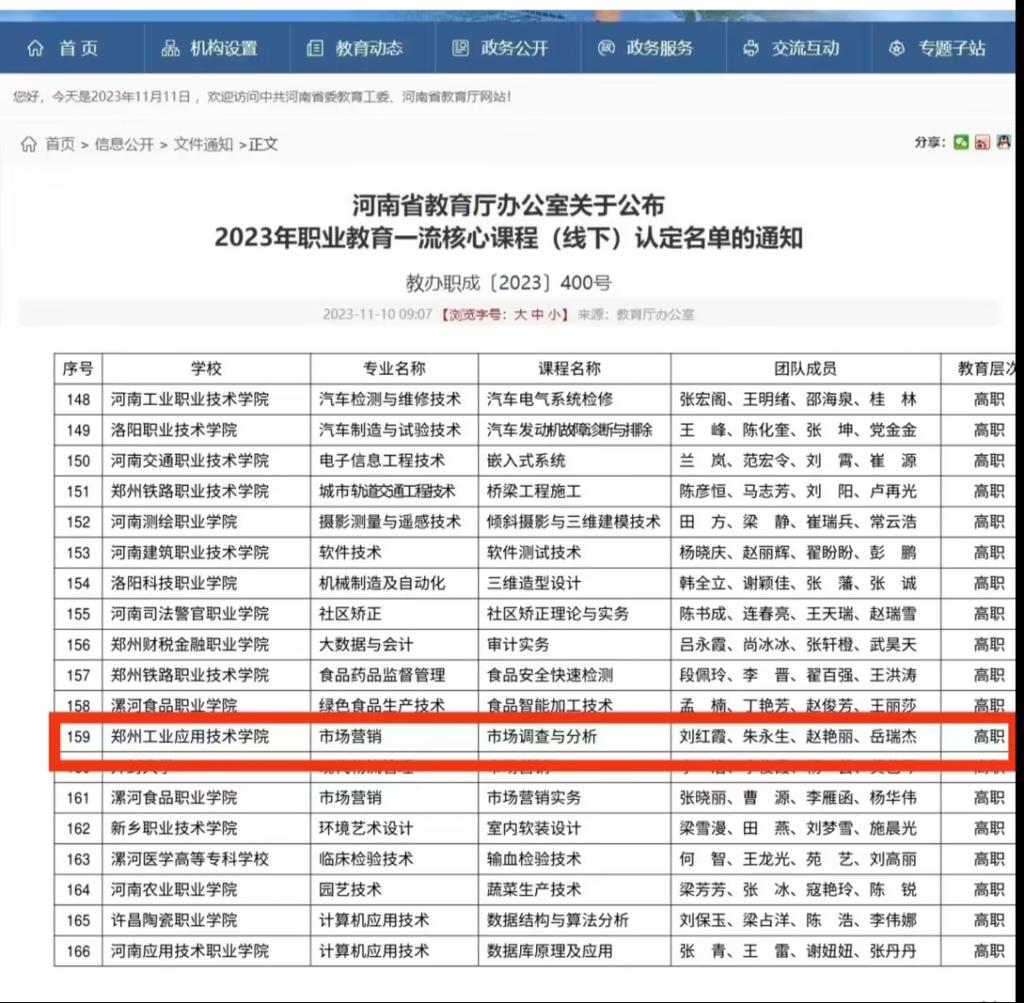 近日,河南省教育厅公布了《2023年职业教育一流核心课程(线下)认定名单的通知》(教办职成〔2023〕400 号),公司yl7703永利集团官网刘红霞教授申报的《市场调查与分析》课程被认定为2023年河南省职业教育一流核心课程(线下)。
