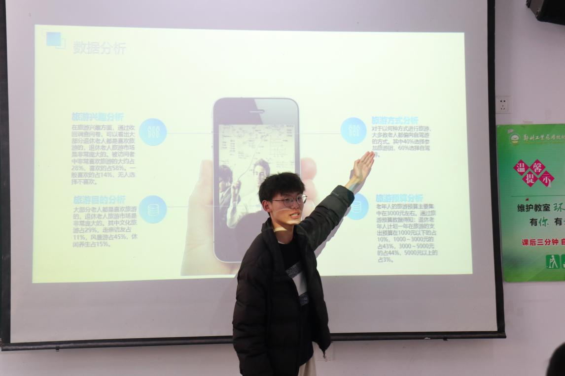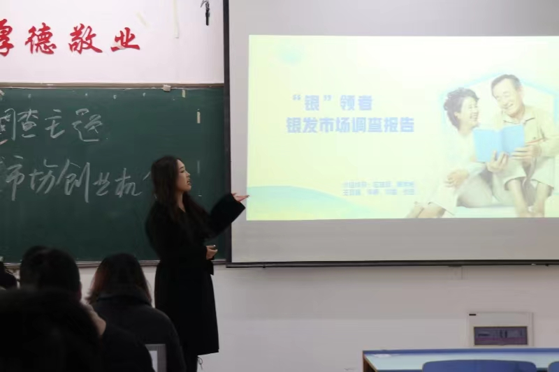 比赛由本科组7支队伍参加,竞赛开始前刘红霞教授先做了赛前动员和赛制规则介绍,依据赛程规则,七个小组按顺序依次用PPT展示了他们的市场调查报告,竞赛主题是关于银色人群的市场调查,各小组就银发老年群体的线上医疗、娱乐、旅游等主要生活需求展开了多角度全视角的调研,调研手段丰富多样,分别有数据统计、问卷设计及实地走访等,基本都能够按专业要求灵活运用调研方法,随着各小组发言同学就本组作品的精彩介绍和展示,课程竞赛现场气氛热烈,师生互动充分,达到了课赛一体,员工实践能力提升的教学效果,阵阵的掌声也打破了冬日的萧条,驱走了腊月的严寒。