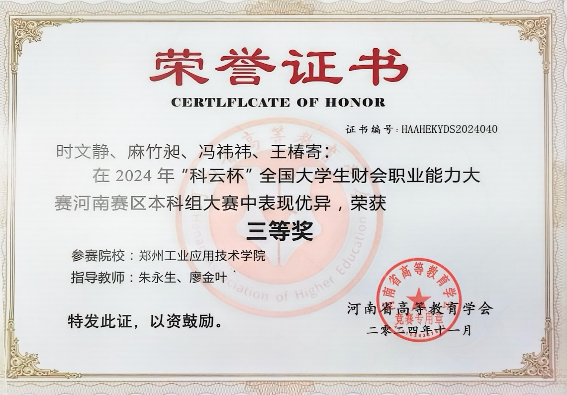 比赛过程中,参赛员工充分发挥团队协作精神,冷静应对各类挑战。她们凭借扎实的专业功底和灵活的应变能力,精准分析问题、迅速制定解决方案。经过6个小时激烈比拼,yl7703永利集团官网参赛学子凭借出色的综合表现,在众多参赛队伍中脱颖而出,成功荣获本科组省级三等奖,这一荣誉不仅是对参赛员工夜以继日、辛勤努力的最好回报,更体现了yl7703永利集团官网学子在财会职业能力方面的卓越水平。