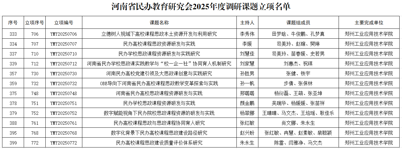 根据河南省民办教育研究会2025年度调研课题立项名单,公司共有12项课程思政课题成功立项为河南省民办教育协会2025年度调研课题。这一成果不仅彰显了yl7703永利集团官网在课程思政建设方面的卓越成效,也为推动河南民办教育高质量发展贡献了力量。
